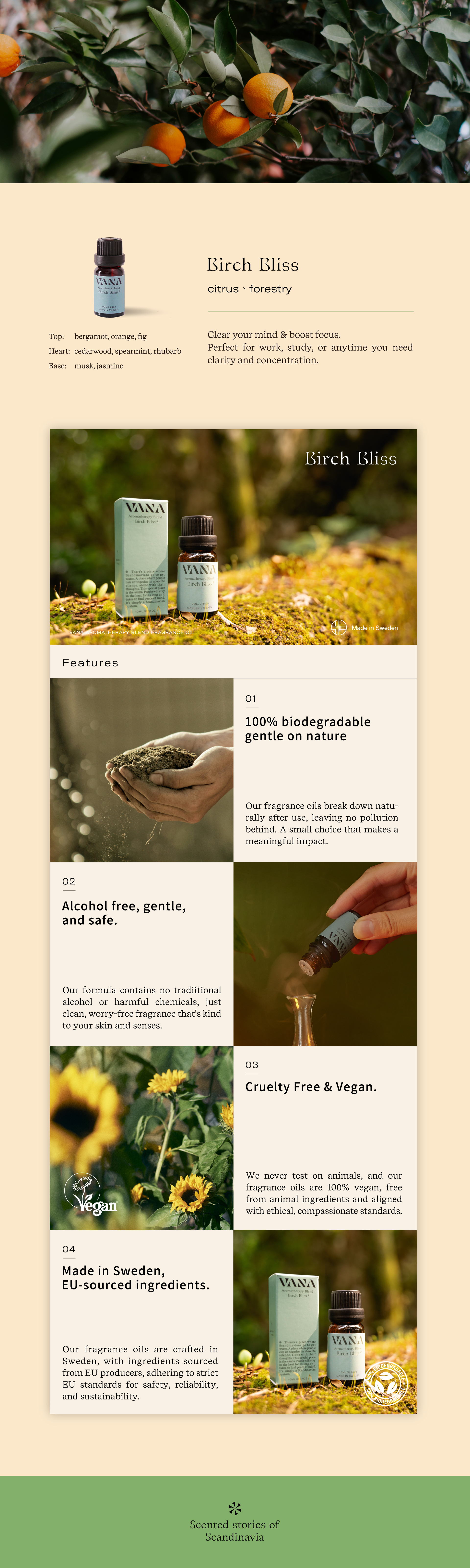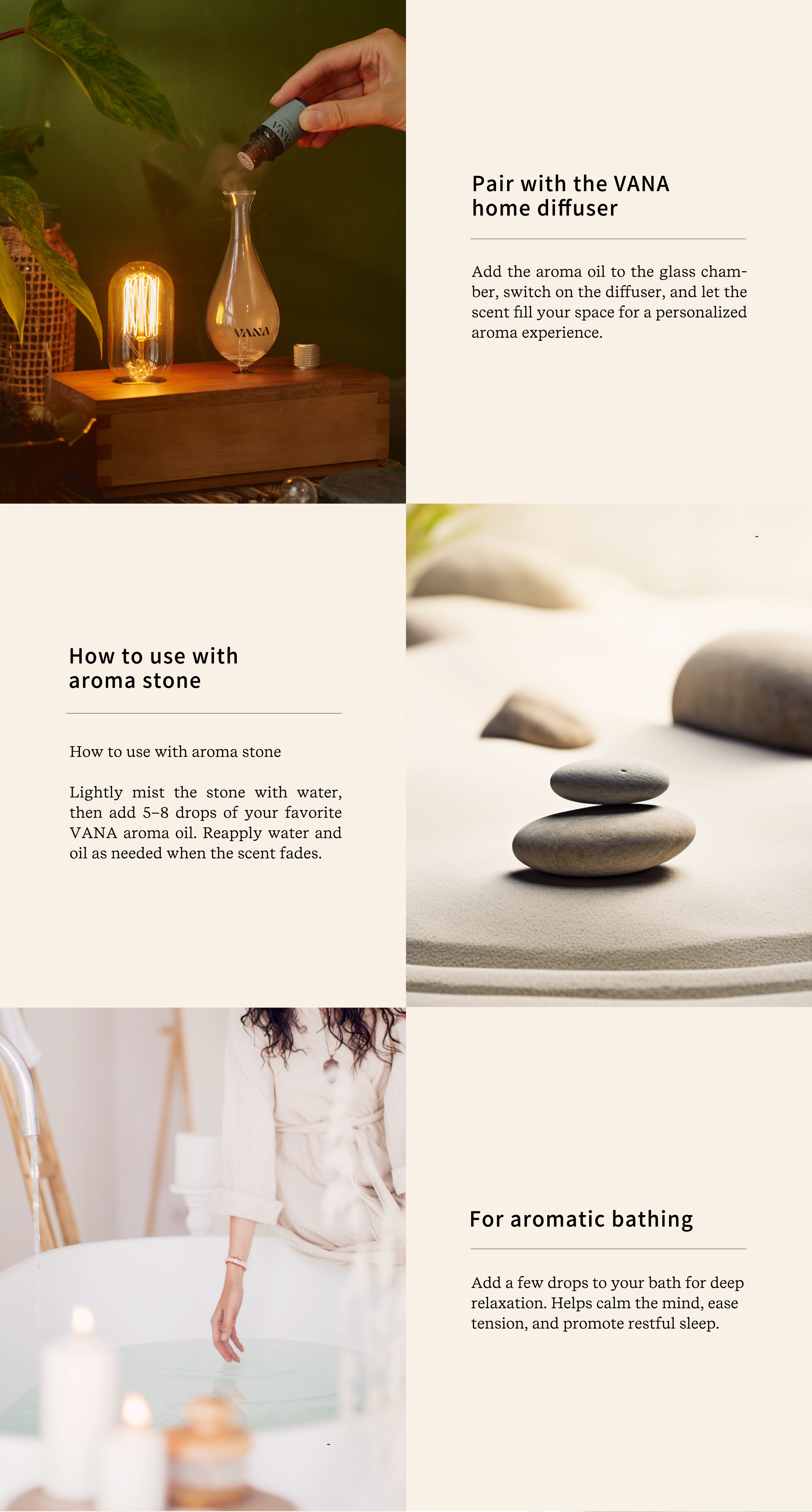 Add VANA essential oil to the glass chamber of the diffuser. Power on the diffuser to release the aroma and create your personalized scented atmosphere.