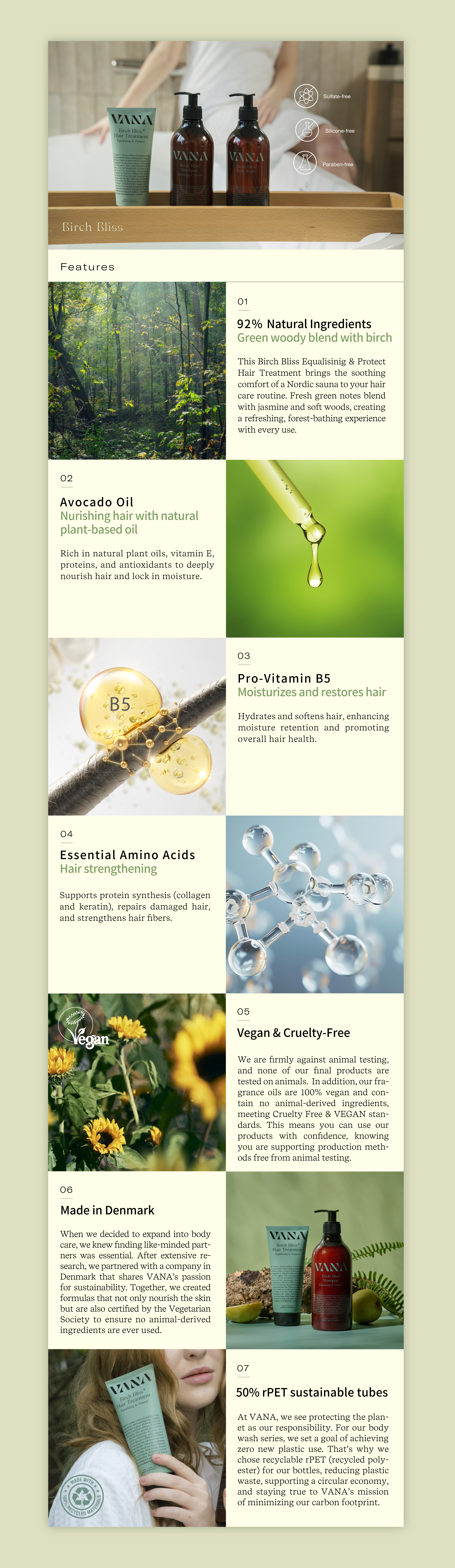 When we decided to expand into bodycare, we knew finding like-minded partners was essential. After extensive research, we partnered with a company in Denmark that shares VANA's passionfor sustainability. Together, we created formulas that not only nourish the skin but are also certified by the Vegetarian Society to ensure no animal-derivedingredients are ever used.