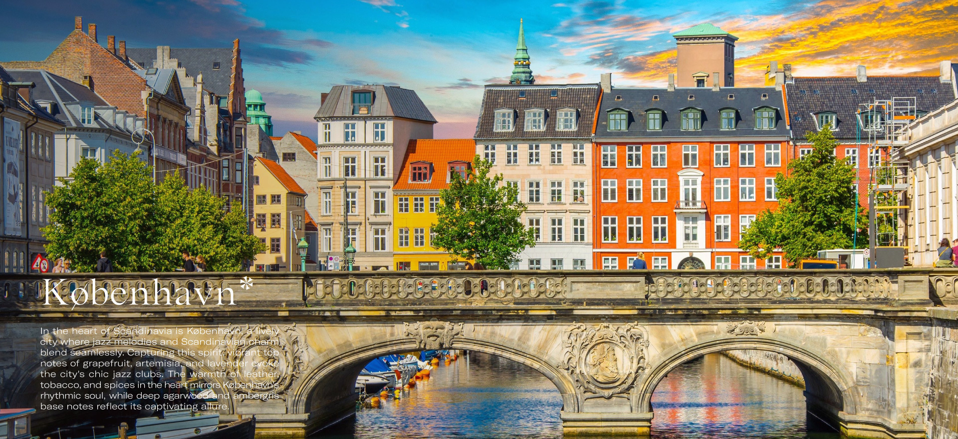 In the heart of Scandinavia is København, a lively city where jazz melodies and Scandinavian charm blend seamlessly. Capturing this spirit, vibrant top notes of grapefruit, artemisia, and lavender evoke the city's chic jazz clubs. The warmth of leather, tobacco, and spices in the heart mirrors Kabenhavn's rhythmic soul, while deep agarwood and ambergris base notes reflect its captivating allure.