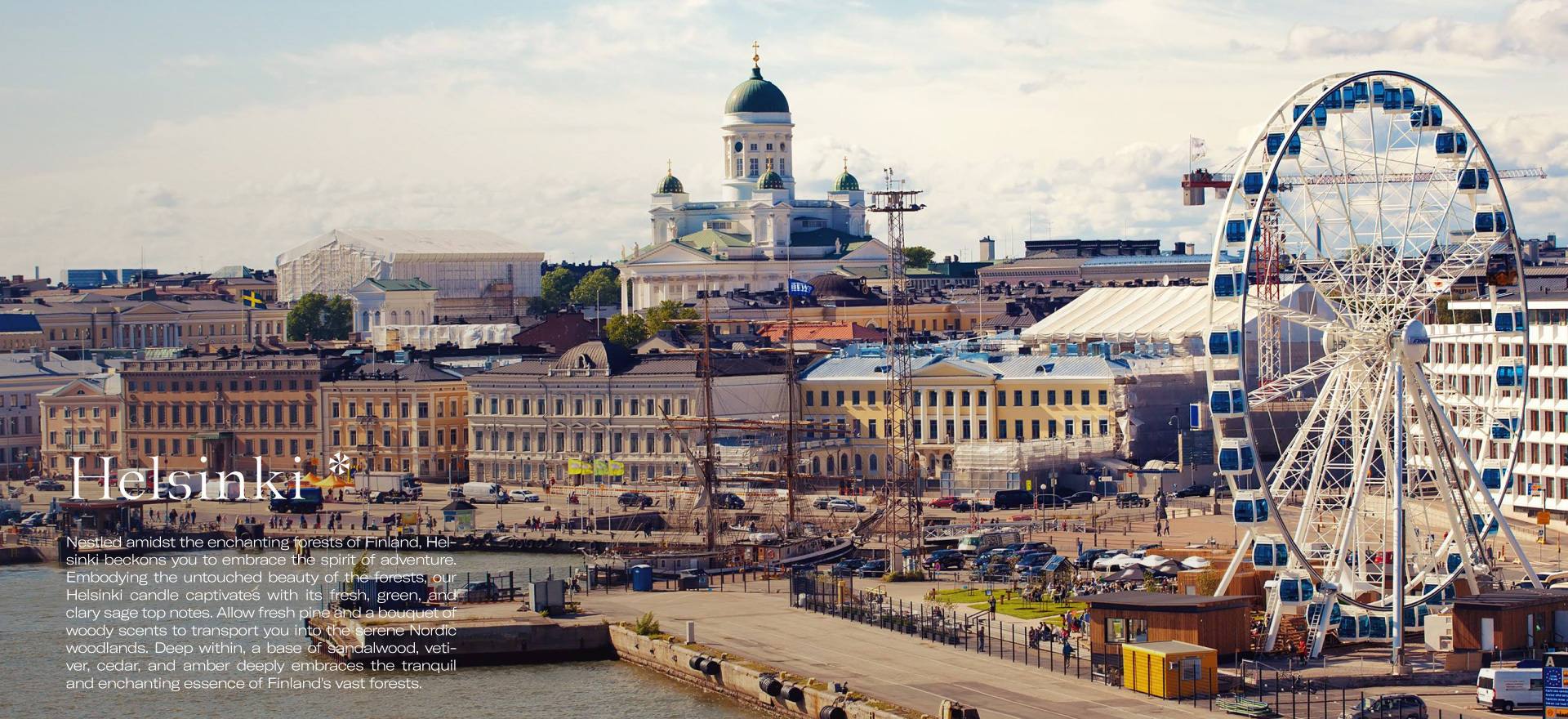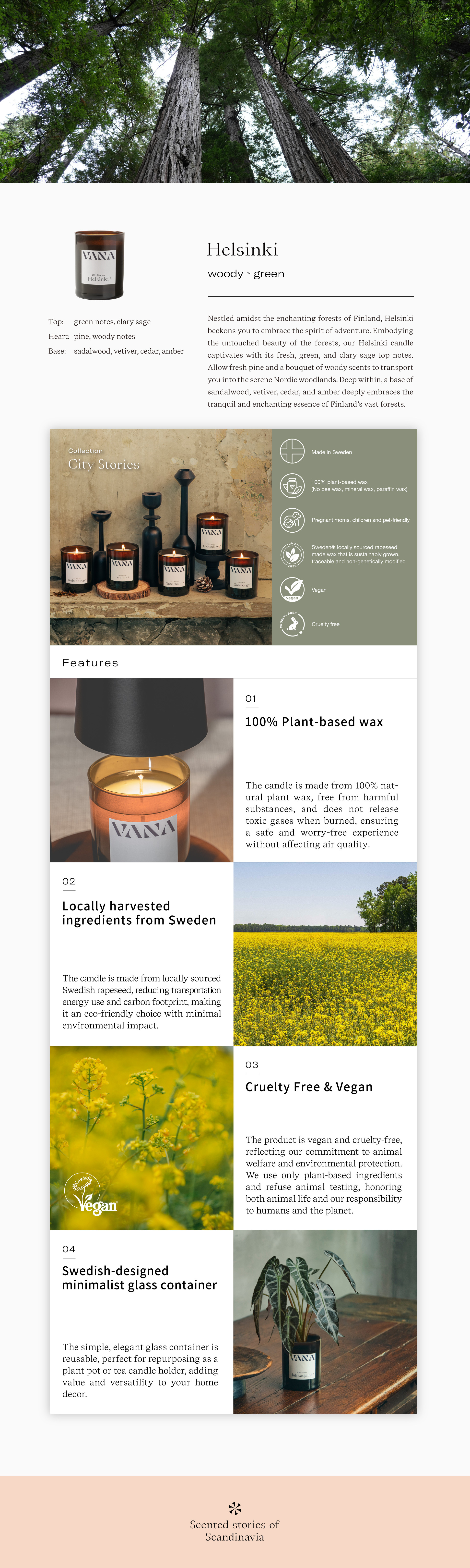Nestled amidst the enchanting forests of Finland, Helsinki beckons you to embrace the spirit of adventure. Embodying the untouched beauty of the forests, our Helsinki candle captivates with its fresh, green, and clary sage top notes. Allow fresh pine and a bouquet of woody scents to transport you into the serene Nordic woodlands. Deep within, a base of sandalwood, vetiver, cedar, and amber deeply embraces the tranquil and enchanting essence of Finland's vast forests.