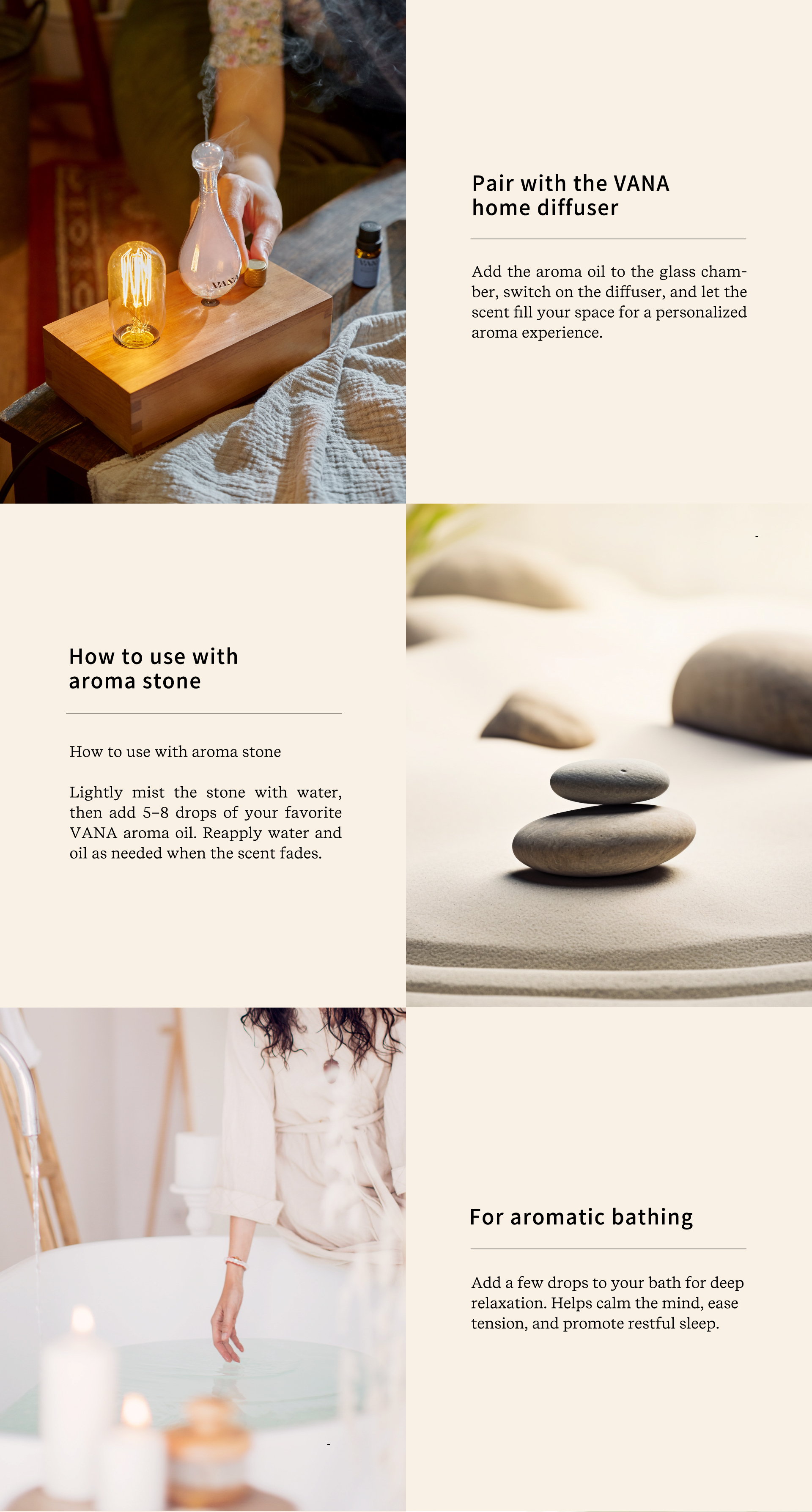 Add VANA essential oil to the glass chamber of the diffuser. Power on the diffuser to release the aroma and create your personalized scented atmosphere.