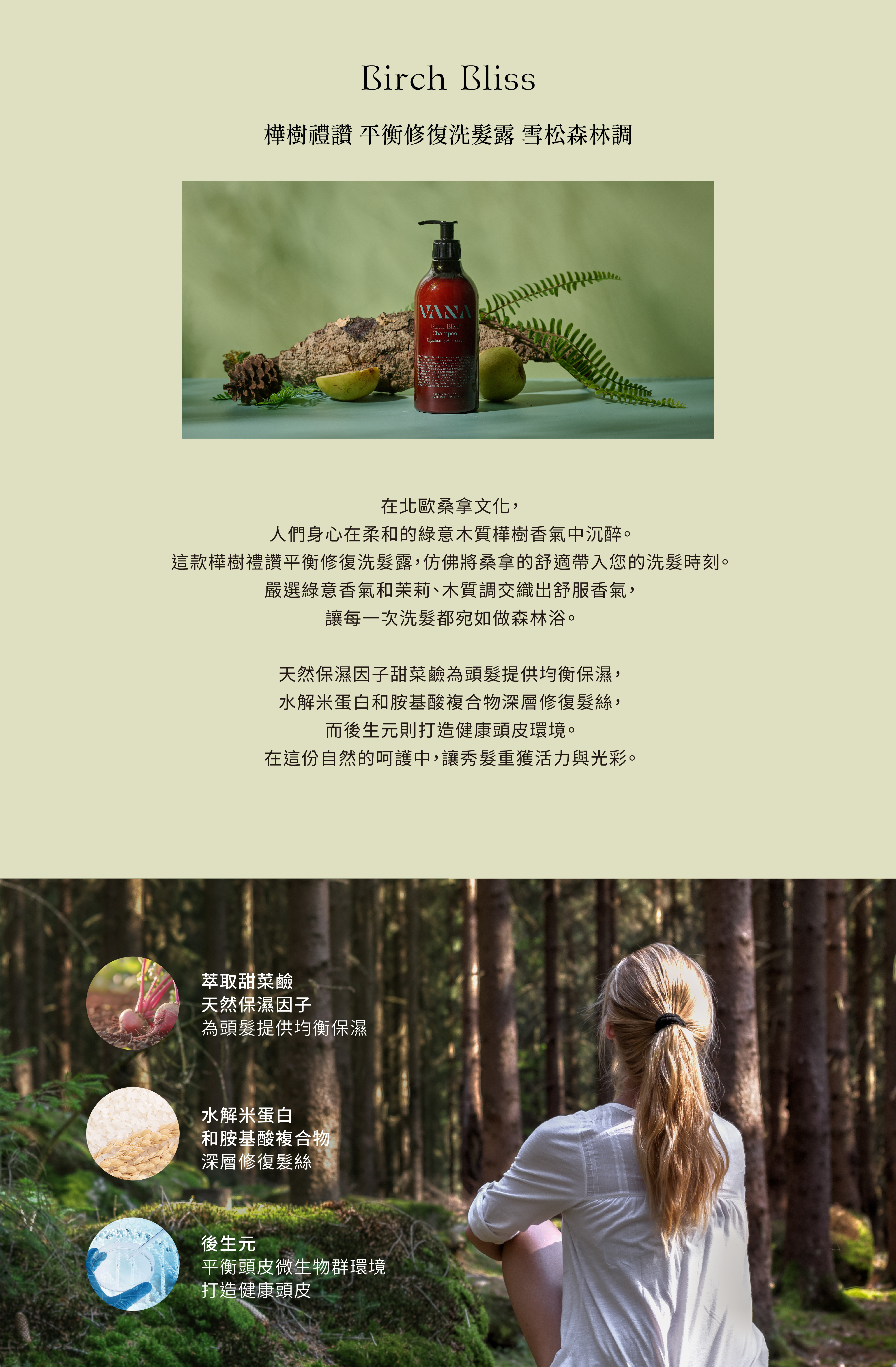 嚴選綠意香氣和茉莉、木質調交織出舒服香氣,讓每一次洗髮都宛如做森林浴。天然保濕因子甜菜鹼為頭髮提供均衡保濕,水解米蛋白和胺基酸複合物深層修復髮絲,而後生元則打造健康頭皮環境。在這份自然的呵護中,讓秀髮重獲活力與與光彩。