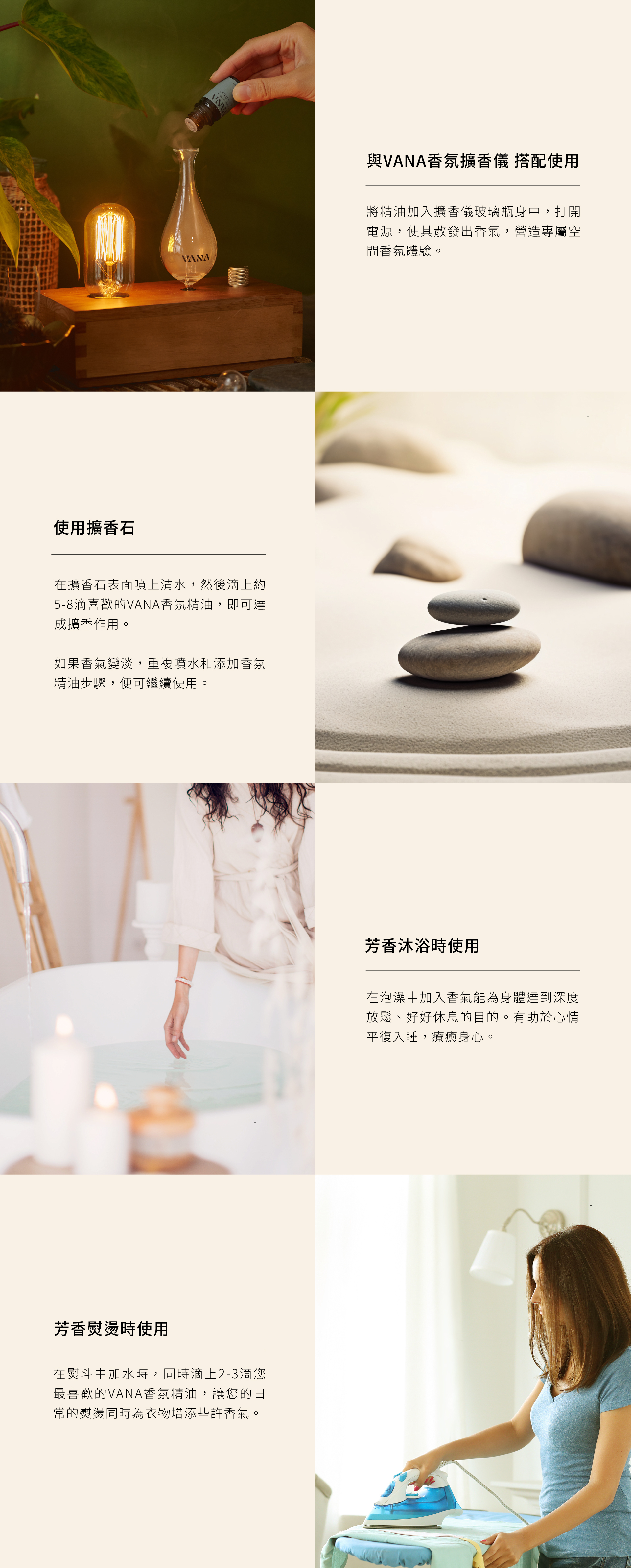 將VANA香氛精油加入擴香儀玻璃瓶身中,打開電源,使其散發出香氣,營造專屬空間香氛體驗。