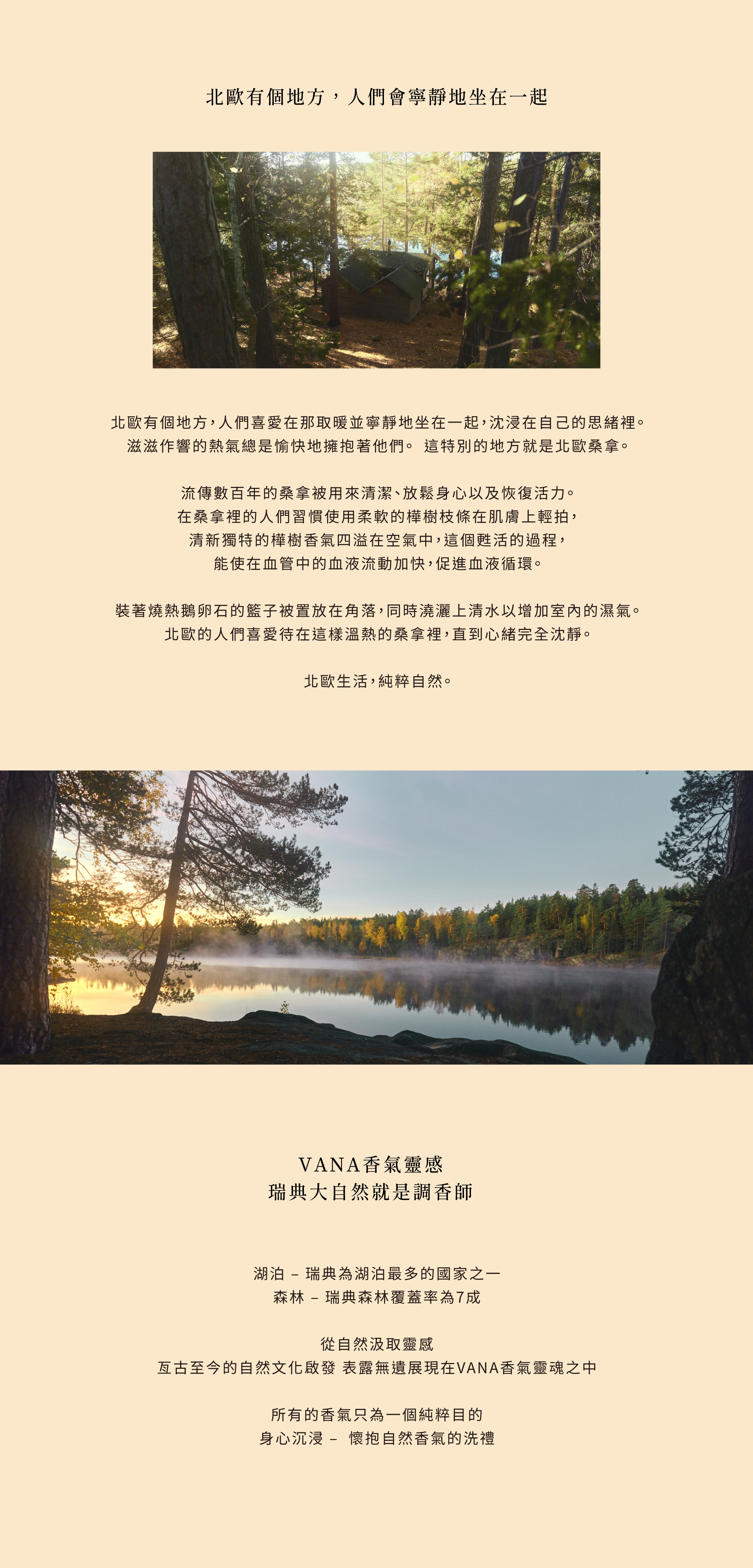 北歐有個地方,人們喜愛在那取暖並寧靜地坐在一起,沈浸在自己的思緒裡。滋滋作響的熱氣總是愉快地擁抱著他們。這特別的地方就是北歐桑拿。流傳數百年的桑拿被用來清潔、放鬆身心以及恢復活力。在桑拿裡的人們習慣使用柔軟的樺樹枝條在肌膚上輕拍,清新獨特的樺樹香氣四溢在空氣中,這個甦活的過程,能使在血管中的血液流動加快,促進血液循環。裝著燒熱鵝卵石的籃子被置放在角落,同時澆灑上清水以增加室內的濕氣。北歐的人們喜愛待在這樣溫熱的桑拿裡,直到心緒完全沈靜。北歐生活,純粹自然。