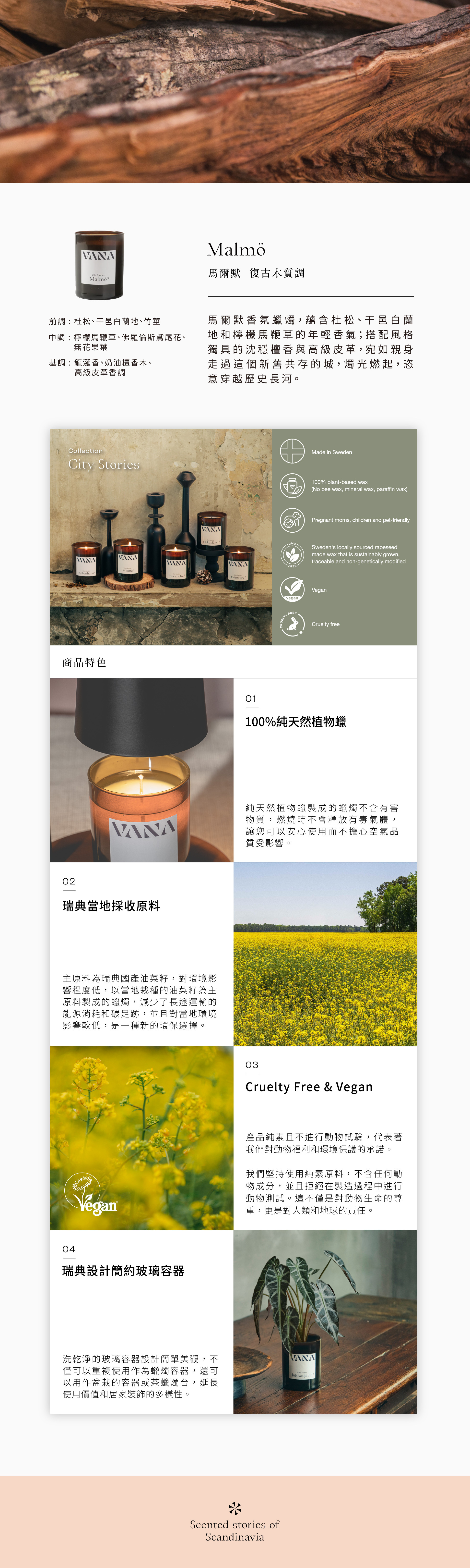 位於瑞典南部的沿海城市,歷史悠久,街道上保留著建造於中世紀時期的半木結構老房。城市靠近海洋的一邊,為運河環繞的老區,另一邊為受實用主義建築風格影響的新區。馬爾默香氛蠟燭,蘊含杜松、干邑白蘭地和檸檬馬鞭草的年輕香氣;搭配風格獨具的沈穩檀香與高級皮革,宛如親身走過這個新舊共存的城,燭光燃起,恣意穿越歷史長河。