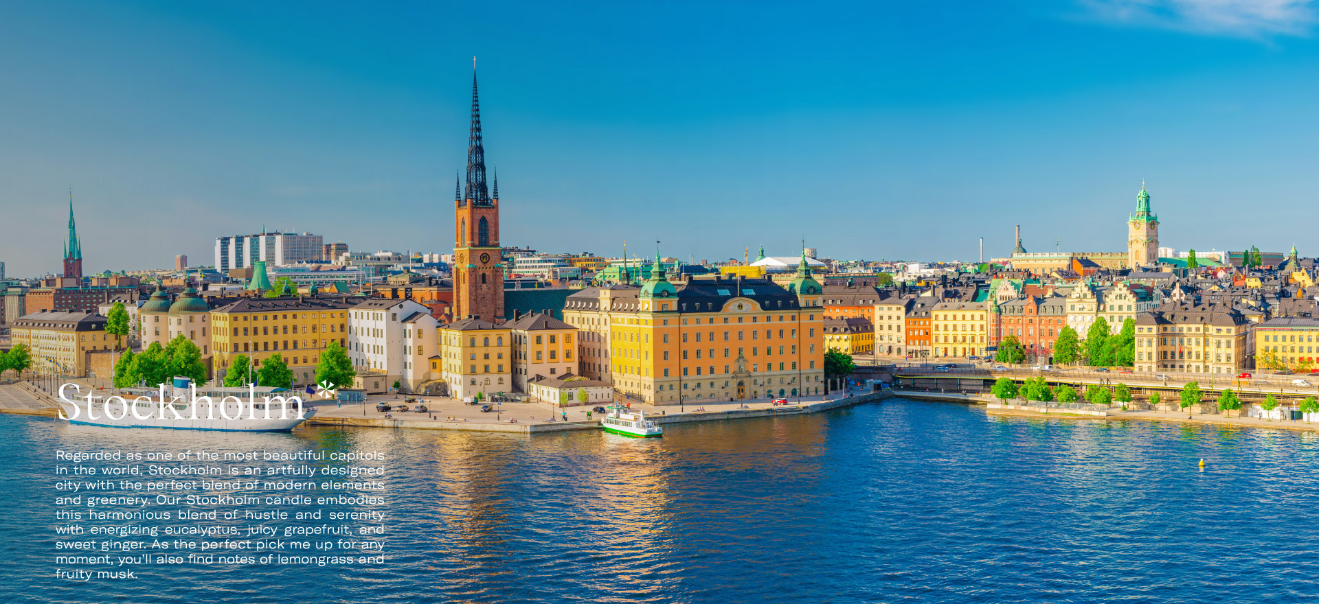 保留三分之一的水源,三分之一的公園和三分之一的城市,斯德哥爾摩是瑞典的人文與藝術匯聚之地。這座經過精心設計的城市,隨處可見蓊鬱綠意。斯德哥爾摩香氛蠟燭以充滿活力的桉樹、多汁酸甜的葡萄柚與甜薑和諧搭配,檸檬草和麝香做為綿長尾韻。最適合在喧囂繁雜的一天過後,作為洗滌心靈,重返寧靜的完美配方。