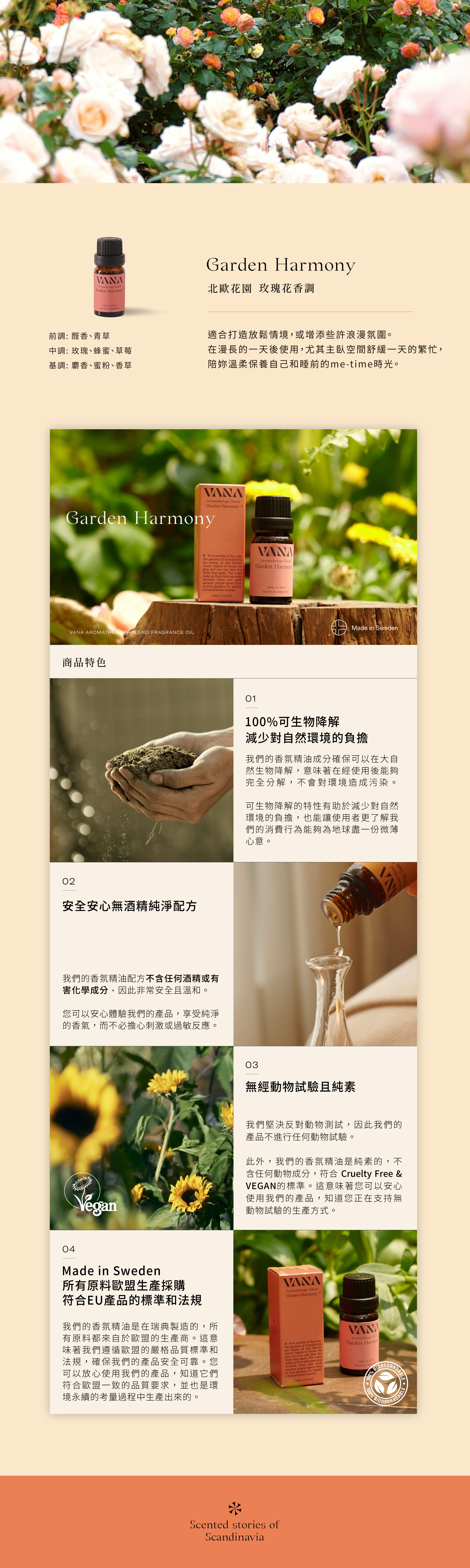 斯堪地納維亞花園需要五個月的冬眠時間。期間,大地凍結、花草枯寂,萬物蕭然且寂靜。直到三月下旬,籠罩大地的冬天逐漸褪去,人們可以聽見鳥兒再次鳴唱,自然萬物也為接下來的拜訪做好了準備。當人們的臉龐能感覺到溫暖的陽光,代表著整頓花園、仔細抹去冬天痕跡的時刻到了。逐漸地,花園裡的玫瑰從沈睡中甦醒,緩慢地伸向天際、攀附在牆面上,等待那嬌豔的花瓣再一次綻放。空氣中藏不住地透露出花園玫瑰們所帶來的馥郁清甜、夾雜泥炭的淡雅香氣,用最討人喜歡的方式告訴人們—春天到了。此刻開始直到秋季,人們喜愛在花園裡消磨時光。北歐生活,純粹自然。