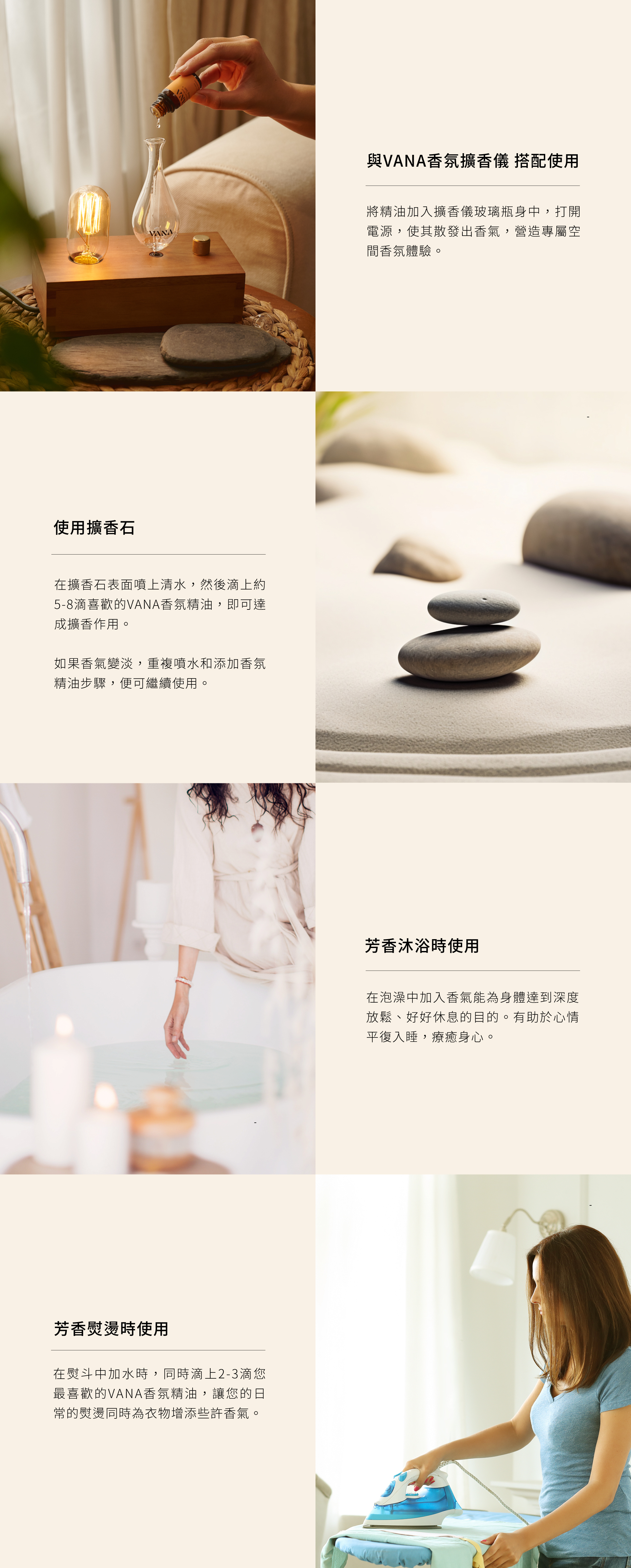 將VANA香氛精油加入擴香儀玻璃瓶身中,打開電源,使其散發出香氣,營造專屬空間香氛體驗。