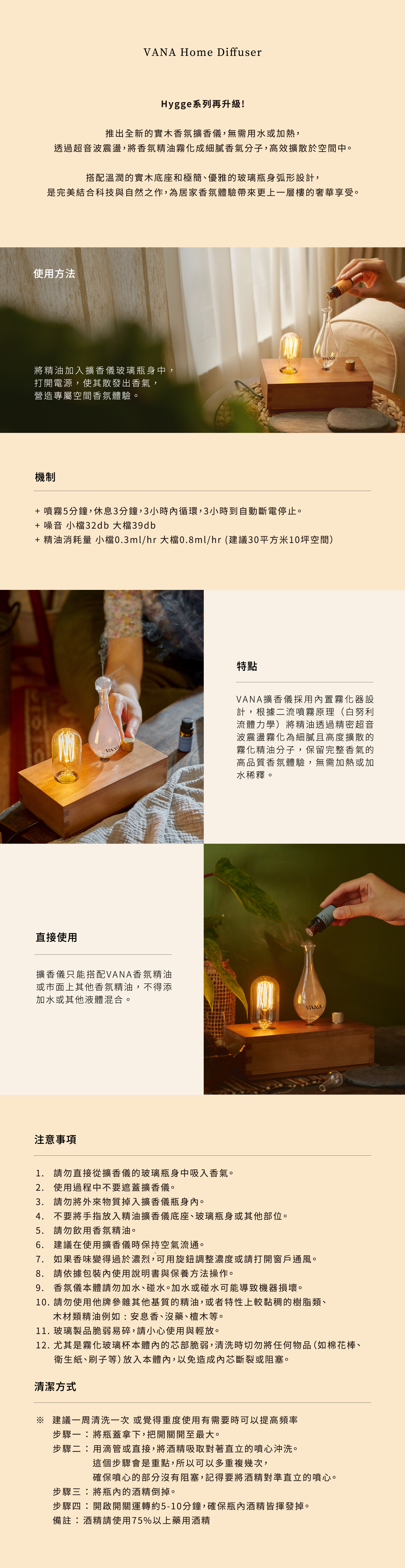 將VANA香氛精油加入擴香儀玻璃瓶身中,打開電源,使其散發出香氣,營造專屬空間香氛體驗。