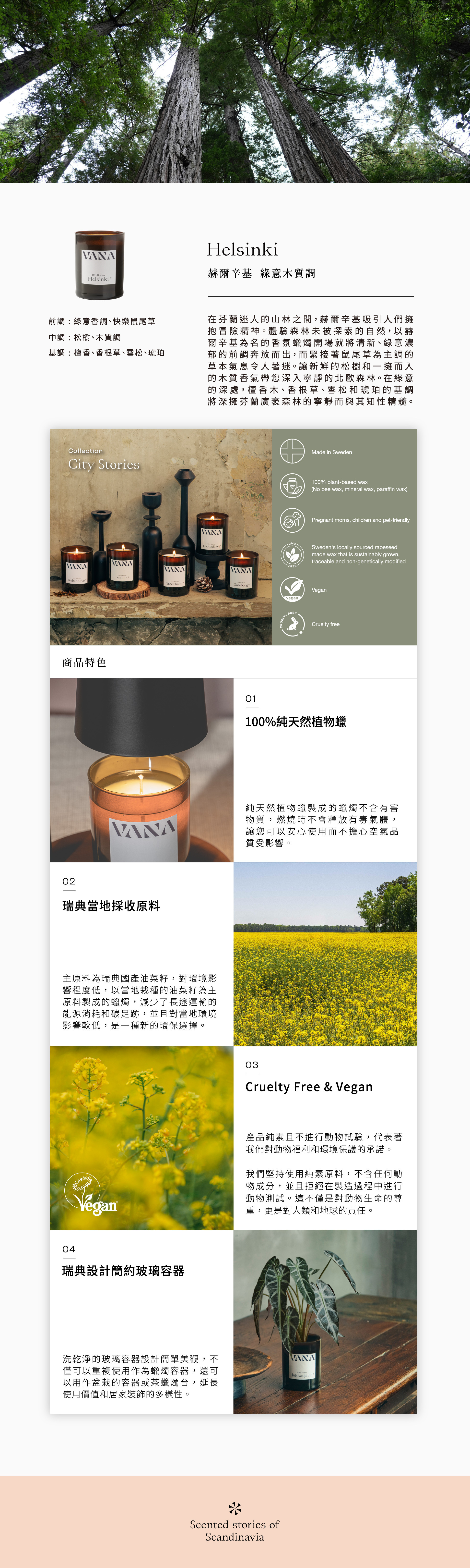 在芬蘭迷人的山林之間,赫爾辛基吸引人們擁抱冒險精神。體驗森林未被探索的自然,以赫爾辛基為名的香氛蠟燭開場就將清新、綠意濃郁的前調奔放而出,而緊接著鼠尾草為主調的草本氣息令人著迷。讓新鮮的松樹和一擁而入的木質香氣帶您深入寧靜的北歐森林。在綠意的深處,檀香木、香根草、雪松和琥珀的基調將深擁芬蘭廣袤森林的寧靜而與其知性精髓。