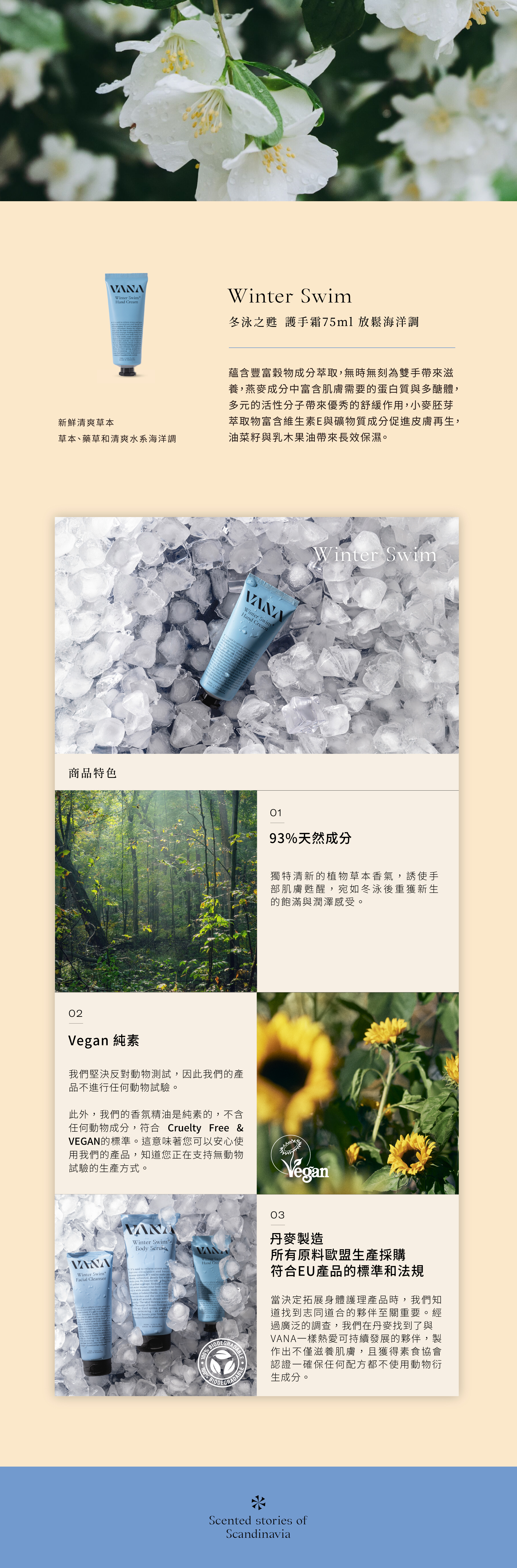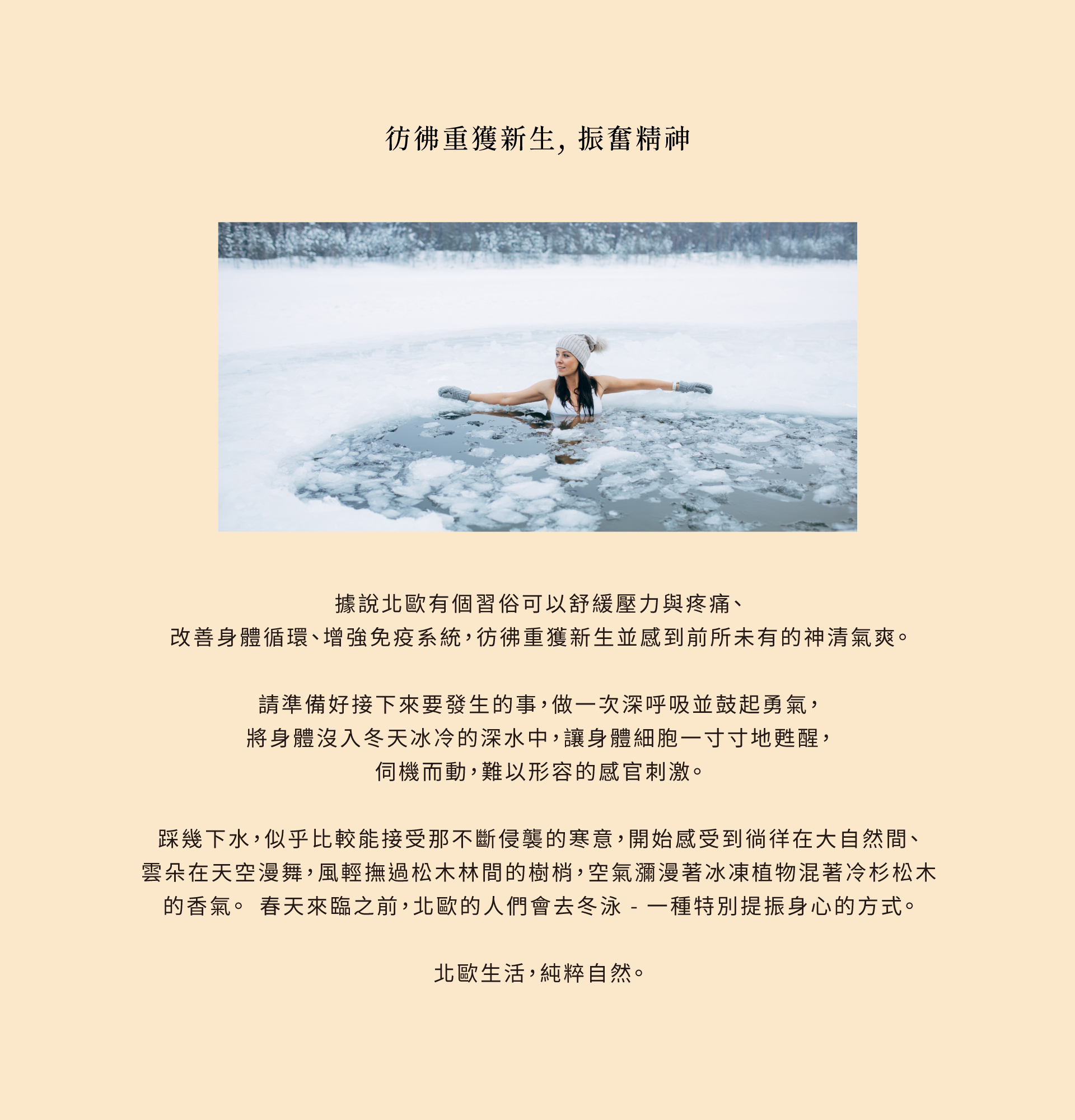 據說北歐有個習俗可以舒緩壓力與疼痛、改善身體循環、增強免疫系統,彷彿重獲新生並感到前所未有的神清氣爽。請準備好接下來要發生的事,做一次深呼吸並鼓起勇氣,將身體沒入冬天冰冷的深水中,讓身體細胞一寸寸地甦醒,伺機而動,難以形容的感官刺激。踩幾下水,似乎比較能接受那不斷侵襲的寒意,開始感受到徜徉在大自然間、雲朵在天空漫舞,風輕撫過松木林間的樹梢,空氣瀰漫著冰凍植物混著冷杉松木的香氣。春天來臨之前,北歐的人們會去冬泳 - 一種特別提振身心的方式。北歐生活,純粹自然。